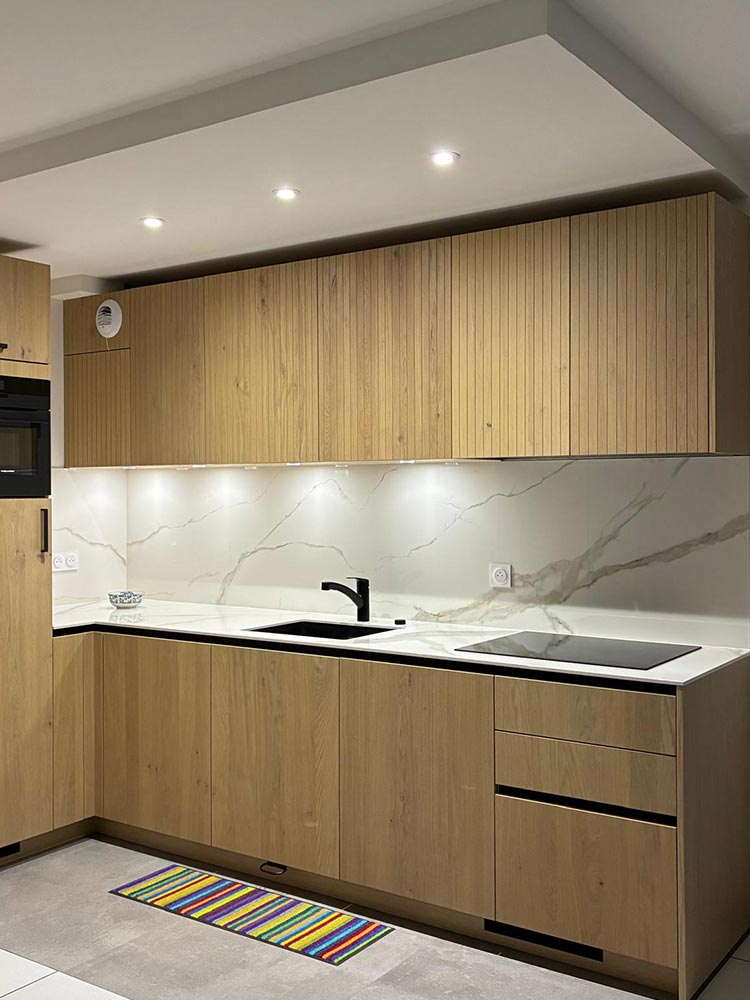 Les meubles hauts intègrent un éclairage LED discret, améliorant le confort d’utilisation.