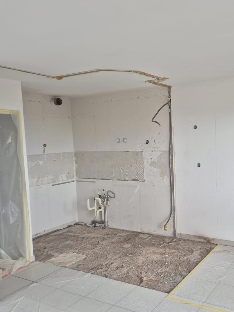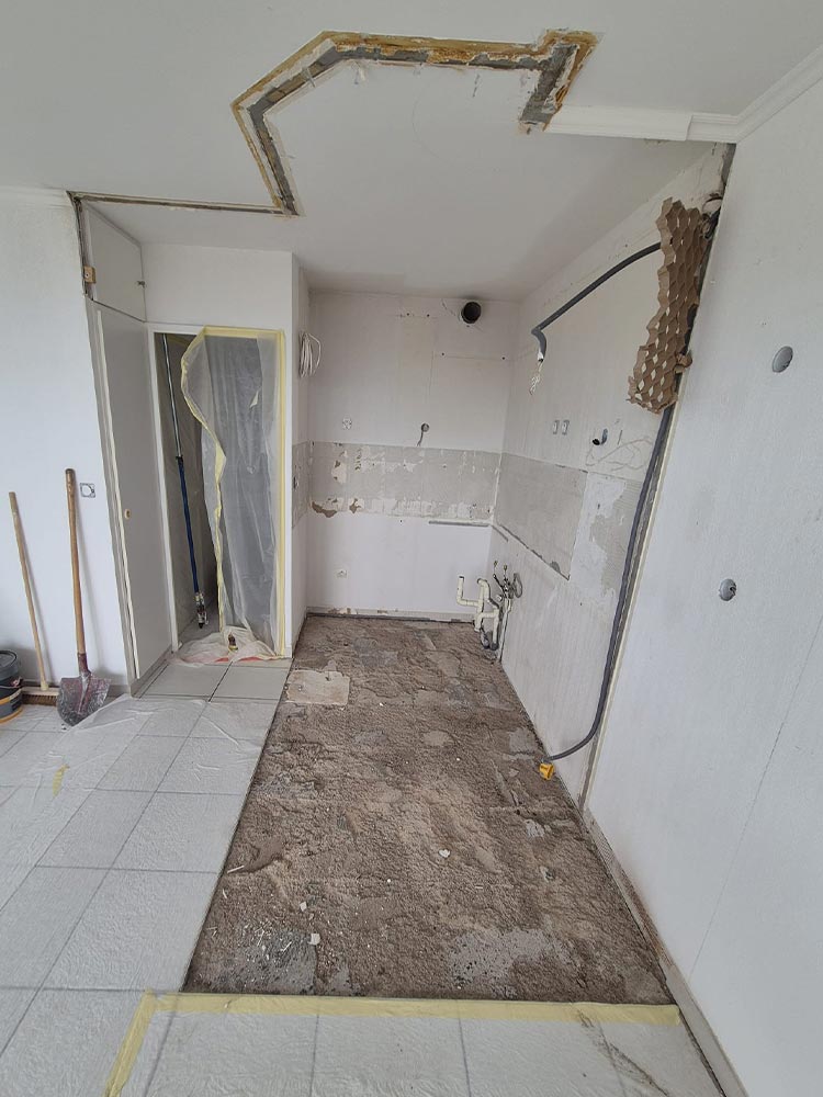 Les murs ont été remis à nu pour permettre la reprise des supports avant la nouvelle implantation. Cette phase implique une coordination entre les postes de maçonnerie intérieure, de plomberie et d’électricité.