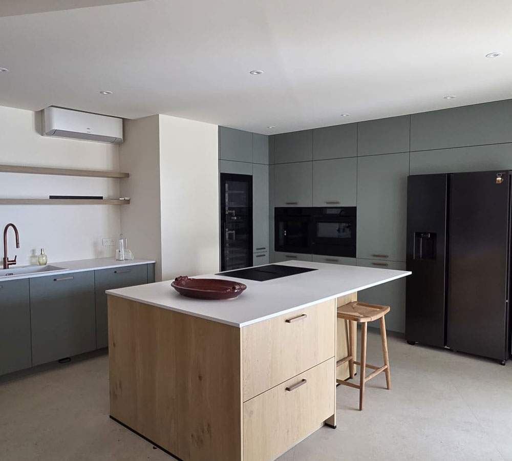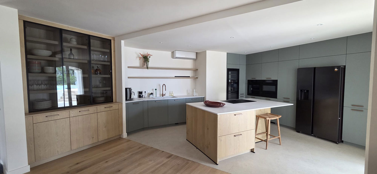 Le cœur du projet : une cuisine design aux façades vert sauge mates, avec un îlot central bois et plan de travail en pierre reconstituée blanche, un vaisselier à verrières industrielles intégré au mur adjacent, des étagères bois suspendues et un bloc électroménager noir mat (frigo américain, four, four vapeur, cave à vin). Le contraste bois clair / vert / noir crée une ambiance contemporaine, douce et enveloppante, parfaitement en phase avec le caractère provençal de la villa.