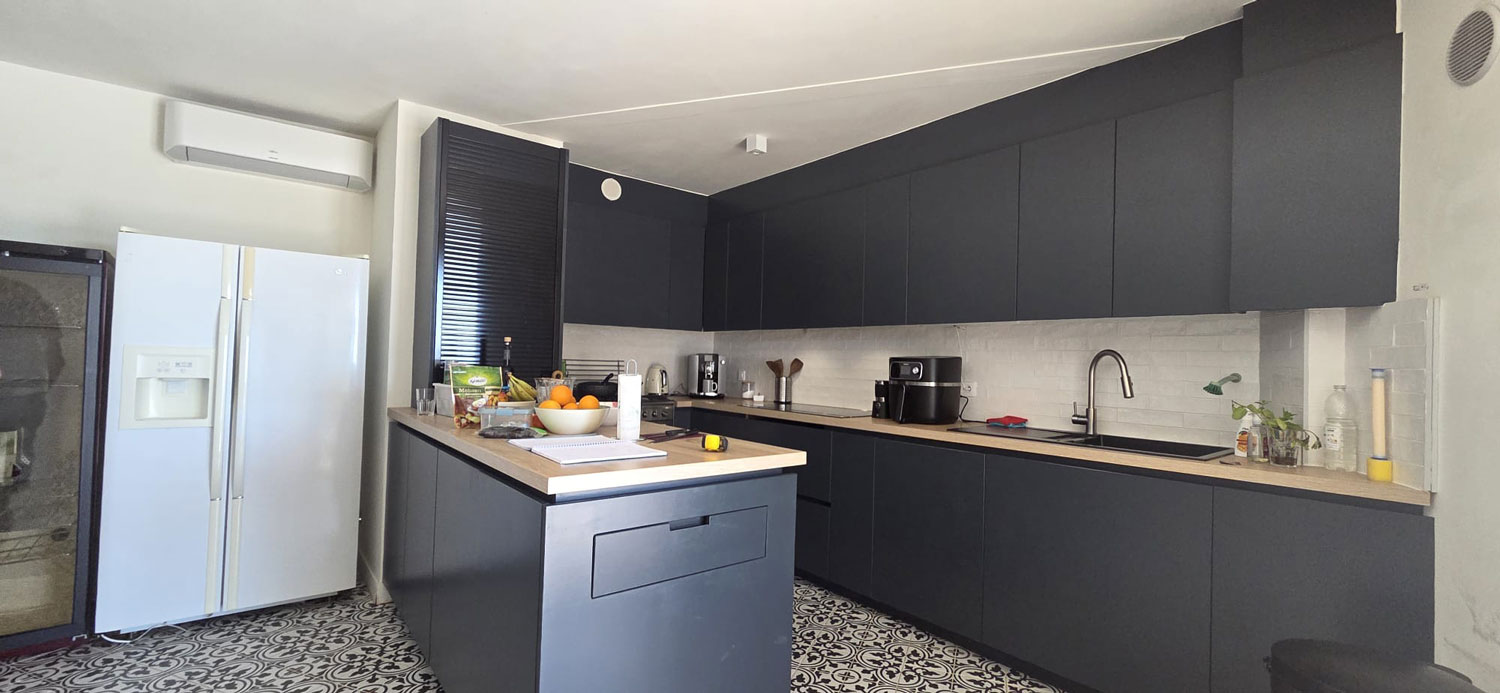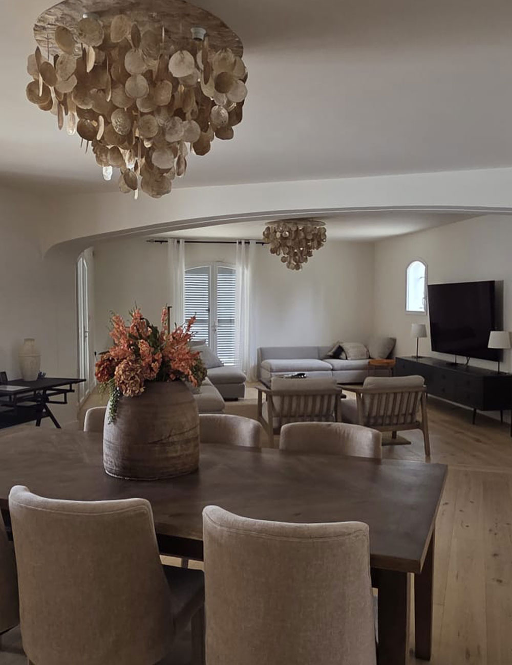 Perchée sur les hauteurs de Flayosc, entre vignobles et oliveraies, la villa profite d’un cadre exceptionnel typique du Haut-Var. Mais à l’intérieur, l’aménagement d’origine ne rendait pas justice au potentiel du lieu : une cuisine fermée aux façades bleu marine et aux carreaux de ciment très marqués, un salon séparé par des cloisons porteuses, et une circulation étriquée entre les pièces de vie.