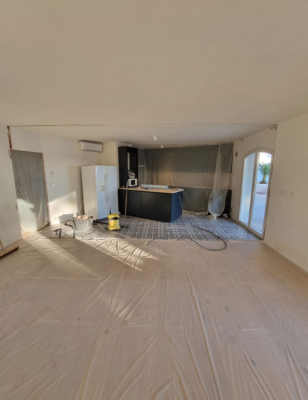 Le chantier a démarré par la dépose complète de l’ancienne cuisine (caissons, plan de travail, électroménager, carreaux de ciment au sol) et la démolition partielle des cloisons séparant la cuisine du séjour. Cette phase gros œuvre et démolition a permis d’ouvrir les volumes et de préparer l’arrivée de la nouvelle distribution.